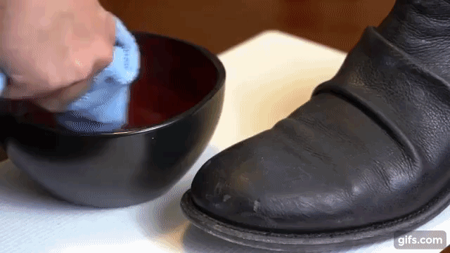 - Trước tiên bạn hãy cho một ít giấm vào bát nhỏ. Sau đó thì dùng vải mềm nhúng vào nước giấm để lau giày.