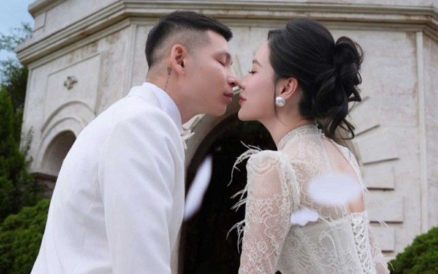 Trong loạt hình cưới vừa được công bố, Mỹ Linh diện váy ren trắng tinh khôi, khoe vẻ đẹp dịu dàng, trong khi chú rể Quang Vinh bảnh bao trong bộ vest trắng. Khoảnh khắc cả hai trao nhau nụ hôn ngọt ngào đã nhanh chóng gây “bão” trên mạng xã hội, nhận về nhiều lời chúc phúc.