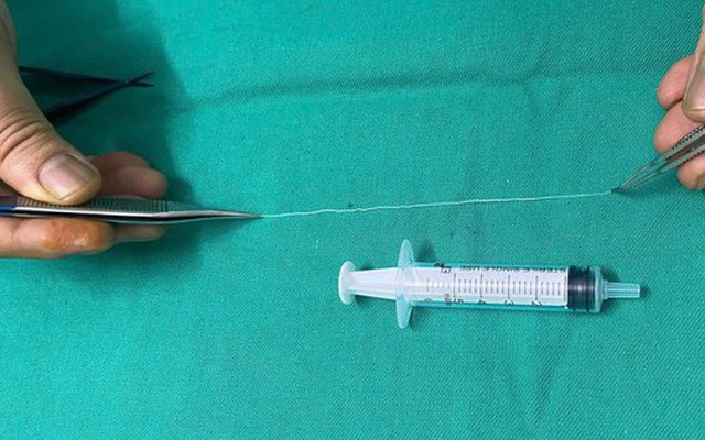 Hình ảnh con giun dài 14 cm được lấy ra khỏi mắt bệnh nhân
