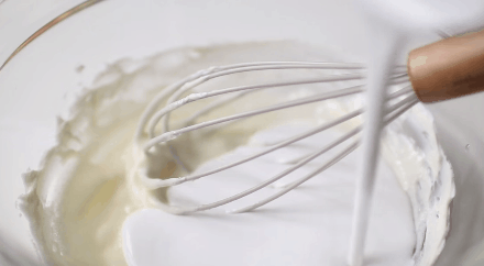 - Tiếp tục cho heavy cream vào hỗn hợp kem phô mai vừa đánh ở trên, đánh cho đến khi kem có chóp cứng.