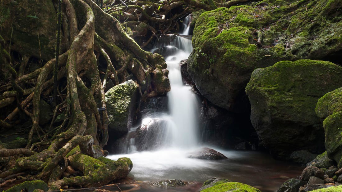 Dưới mặt đất, rễ cây khổng lồ bò tràn lan. Những cây gỗ hồng (Rosewood) cao chót vót như muốn vươn ngọn với tận trời, còn những tán Dracaena draco lại xòa rộng. Dây leo quấn quýt, chiếm lĩnh khắp chốn, bò ra tận bờ suối, nơi dòng nước trong vắt đang đổ thành thác trắng xóa, đẹp diệu kỳ.