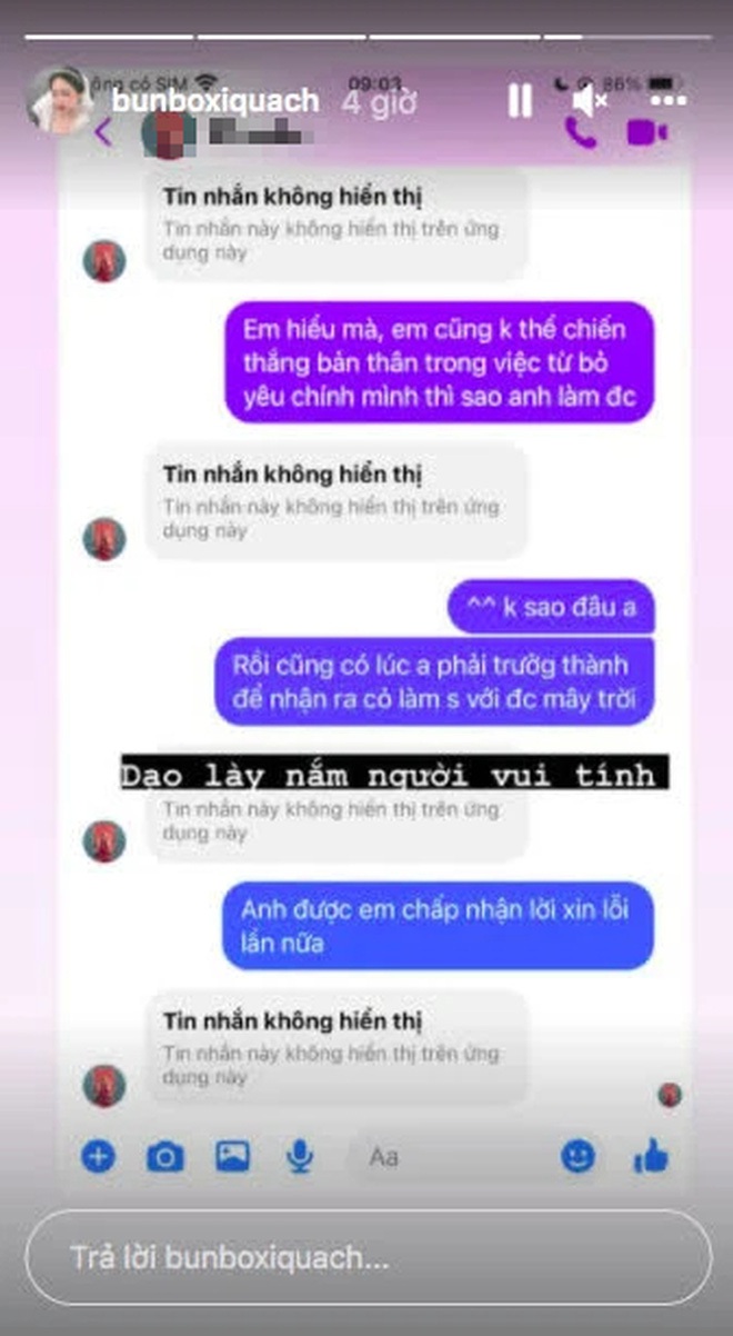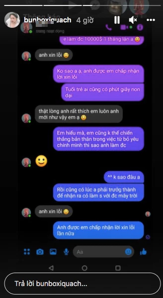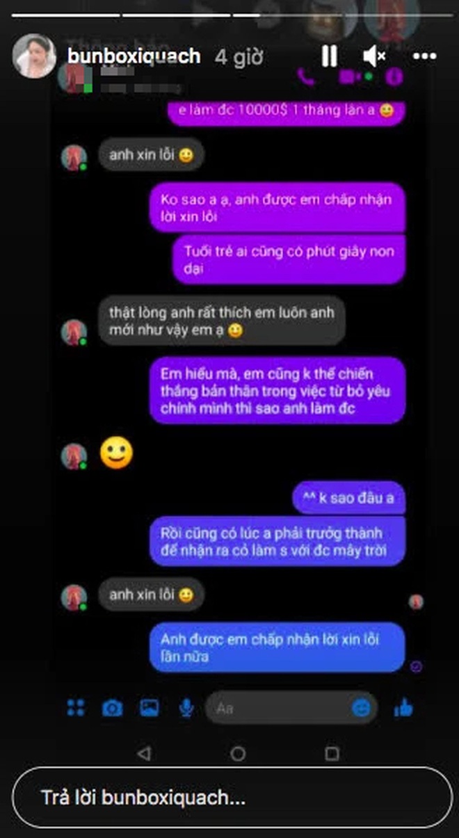 Cuối cùng, cuộc trò chuyện kết thúc bằng màn chấp nhận lời xin lỗi nhưng Kim Sa cũng không quên "dằn mặt": "Em hiểu mà, em cũng không thể chiến thắng được bản thân trong việc từ bỏ yêu chính mình thì làm sao anh làm được... Rồi cũng có lúc anh phải trưởng thành để nhận ra cỏ làm sao với được mây".