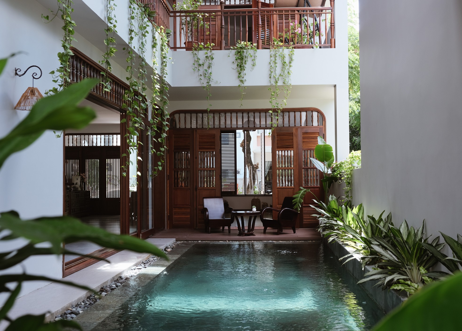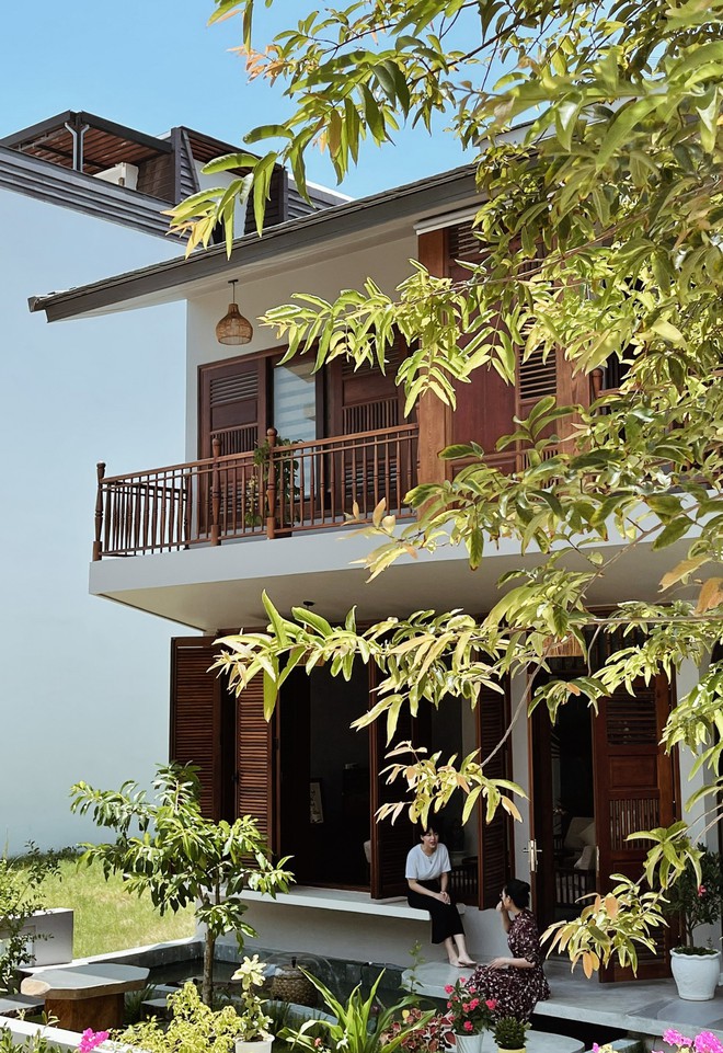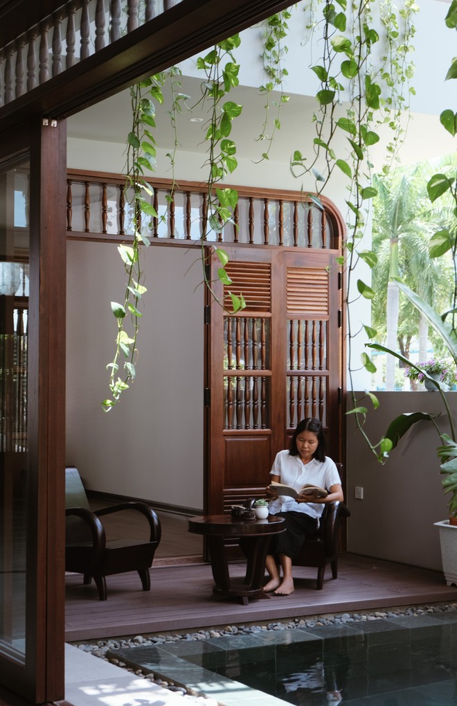 Sự chuyển tiếp không gian nhiều chiều từ trong ra ngoài và từ trên xuống dưới, sự liên kết giữa không gian chung và riêng được đội ngũ kiến trúc sư của An Nam nhấn mạnh bằng hệ cửa gỗ lá sách.