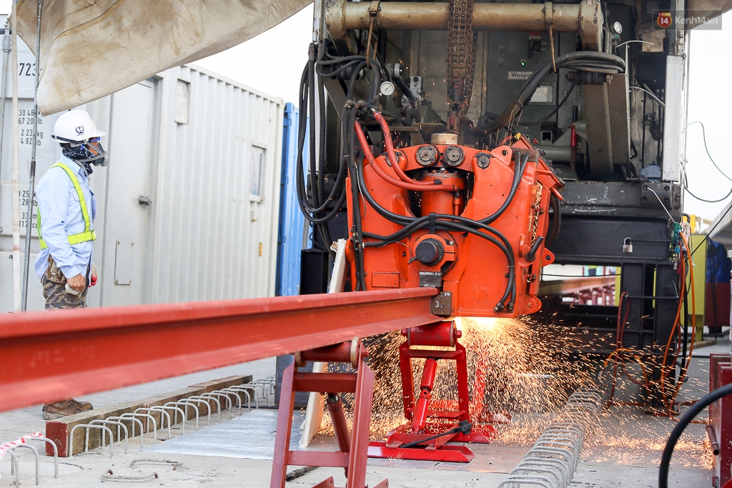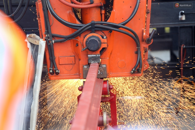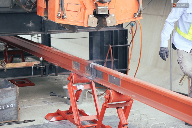 Đúng 8h sáng, các công nhân đã đưa những thanh ray tàu điện ngầm đầu tiên vào vị trí đường sắt trên cao tại Khu vực ga Phước Long (P.Trường Thọ, Q.Thủ Đức). Sau đó tiến hành điều khiển máy hàn công nghiệp để thực hiện nối các thanh ray lại với nhau trước khi đặt xuống mặt sàn bê tông.