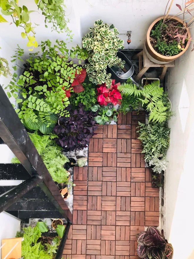 Các kệ và bồn gỗ được sắp xếp khéo léo để tăng diện tích cây xanh.