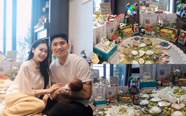 Bên cạnh đó, hình ảnh mâm cúng mụ thịnh soạn dành cho bé Lúa (tên ở nhà của con trai Văn Hậu) cũng nhận nhiều sự chú ý. Cụ thể, nàng WAG và chồng chọn làm mâm cúng theo tone xanh lá.