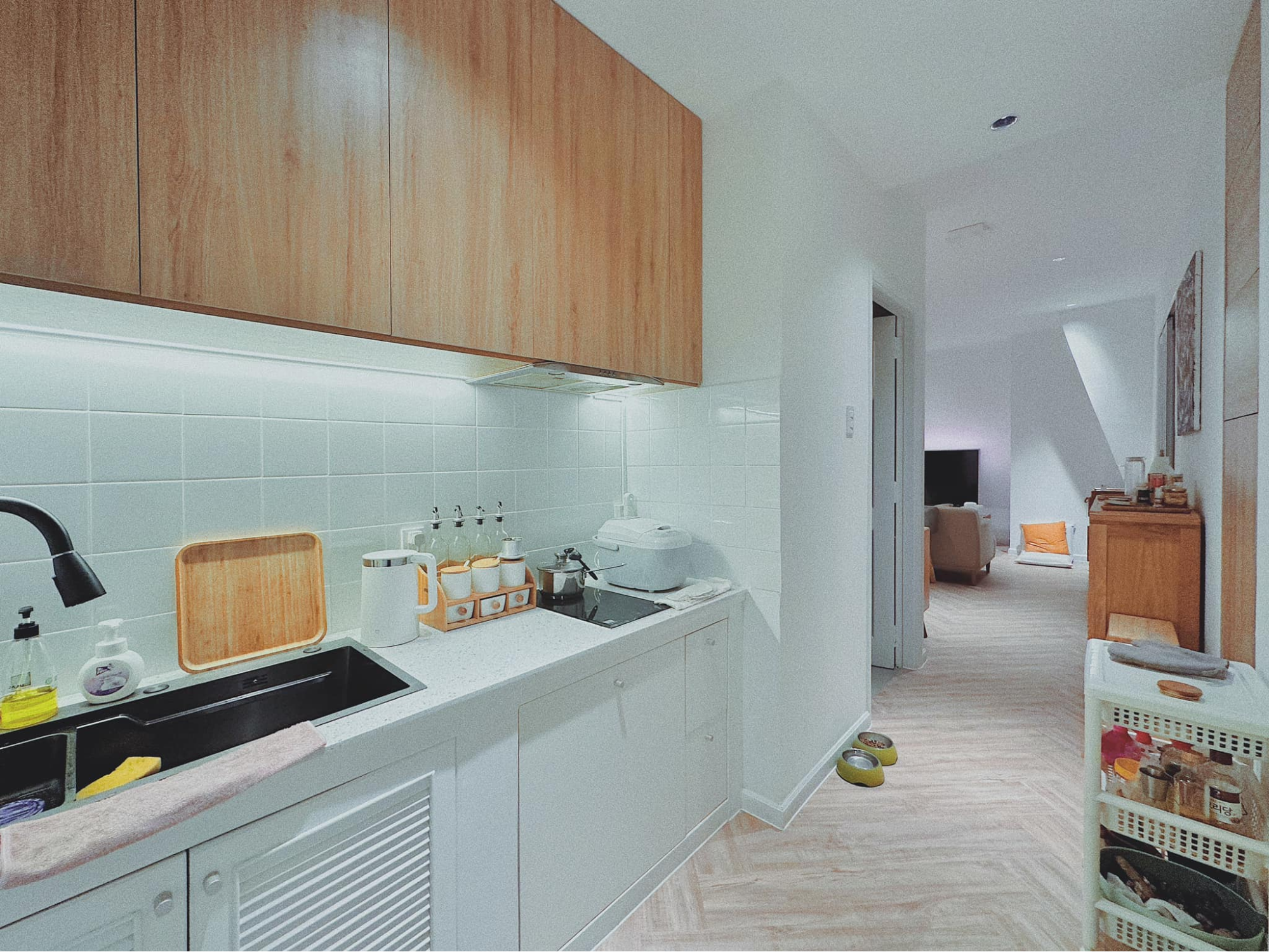 Ba hộc tủ bếp được điều chỉnh lại để đặt vừa một máy rửa chén cũ, vừa giúp bếp tiện nghi hơn vừa là nơi cất chén bát luôn. Chậu rửa một hố lớn và bếp domino dọc luôn là lựa chọn tuyệt vời cho chiếc bếp khiêm tốn diện tích