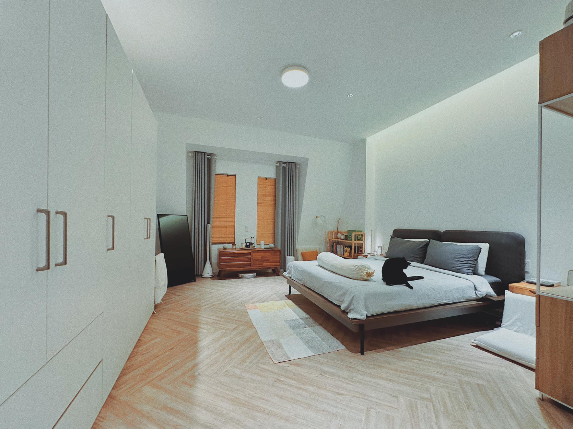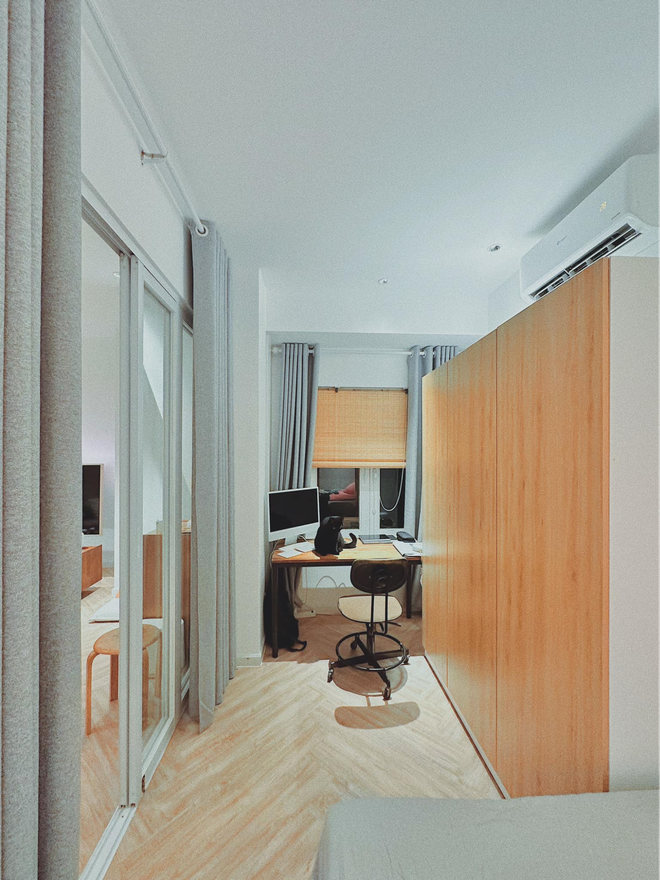 Dù ở nhà thuê thì không gian sống vẫn phải đẹp. Cửa lùa thanh mảnh cánh nhỏ dọc chia không gian nhưng vẫn riêng tư khi cần
