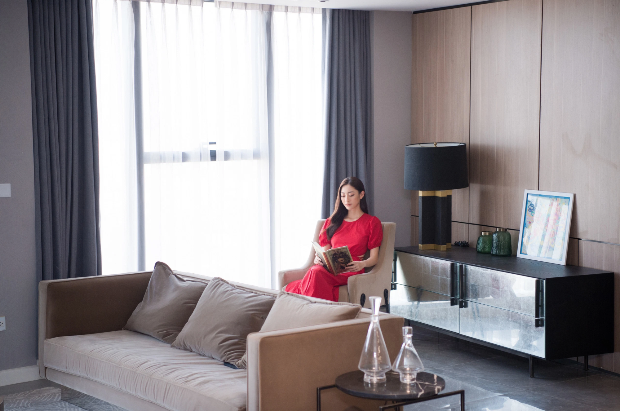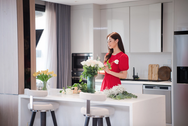Phong cách trang trí nhà của nàng hậu gen Z hướng đến sự hiện đại, tối giản nhưng vẫn không kém phần sang trọng. Tông màu chủ đạo của căn penthouse là trắng, xám, tôn lên không gian thoáng đãng, sáng, giúp Thuỳ Linh tận dụng mọi ngóc ngách để "sống ảo".