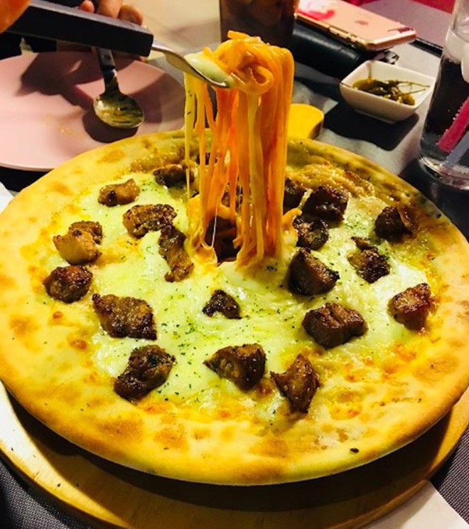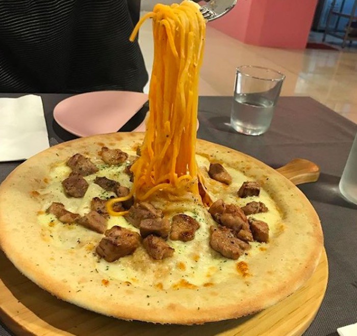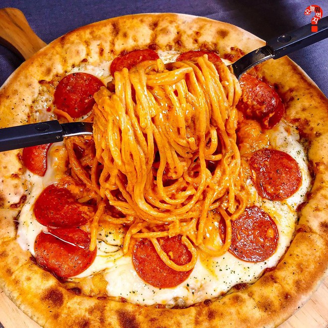Ẩm thực Hàn Quốc không chỉ hấp dẫn với những món ăn truyền thống mà còn thường xuyên cập nhật nhiều hương vị mới lạ từ các nước khác. Chẳng hề gò bó trong một khuôn khổ nào, mỗi món ăn luôn là đề tài sáng tạo khi đến đây. Bằng chứng là bạn sẽ bị đánh lừa thị giác bởi món bánh pizza này, mà nói đúng hơn thì đây chính là một phần mì spaghetti đúng nghĩa đấy. Bạn có tin được không?