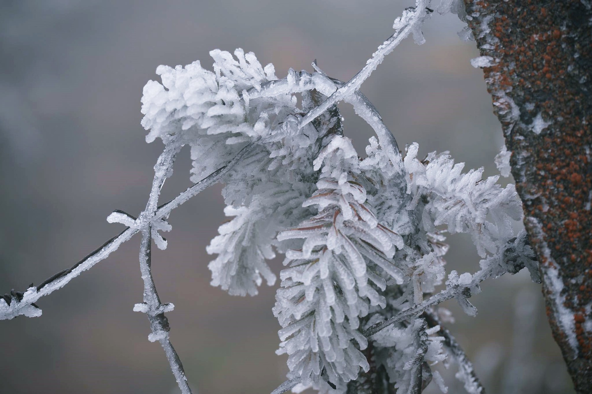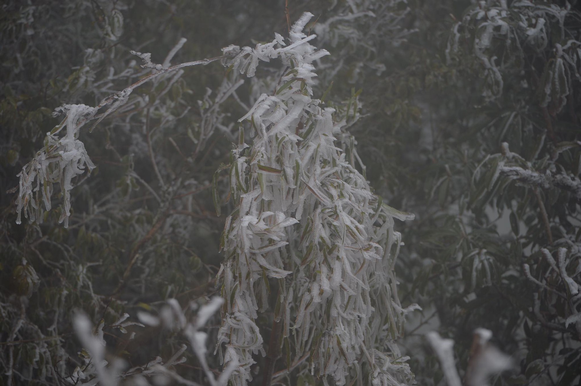 Cây cối xung quanh khu vực đèo Ô Quy Hồ bị băng tuyết bao phủ trắng xóa