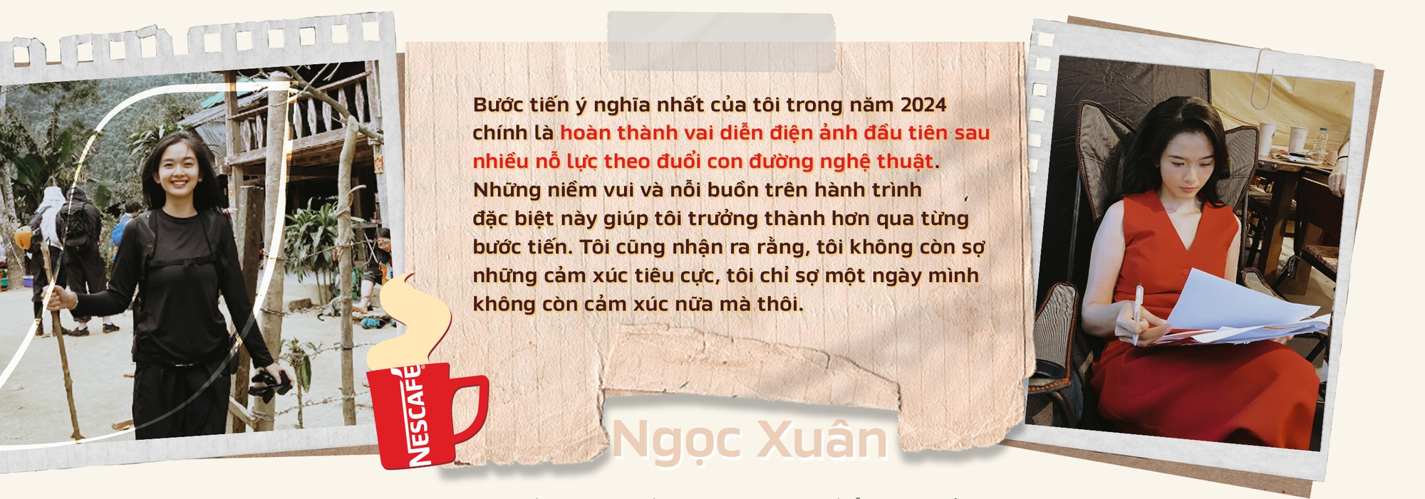 Cũng trên hành trình "tiến bước" ấy, bên cạnh niềm tin và sự quyết tâm, tách cà phê Nescafé đã trở thành người bạn đồng hành không thể thiếu, luôn tiếp thêm năng lượng để Ngọc Xuân hoàn thành từng mục tiêu một cách tốt nhất. Nescafé khơi dậy cảm hứng vào mỗi buổi sáng, duy trì sự bền bỉ và tinh thần sáng tạo trong mỗi buổi diễn tập, hay mỗi lần cần sự tập trung để hoàn thành công việc. Từng ngụm cà phê, từng trang kịch bản, từng bước tiến nhỏ dần đưa Ngọc Xuân tiến đến với giấc mơ điện ảnh.