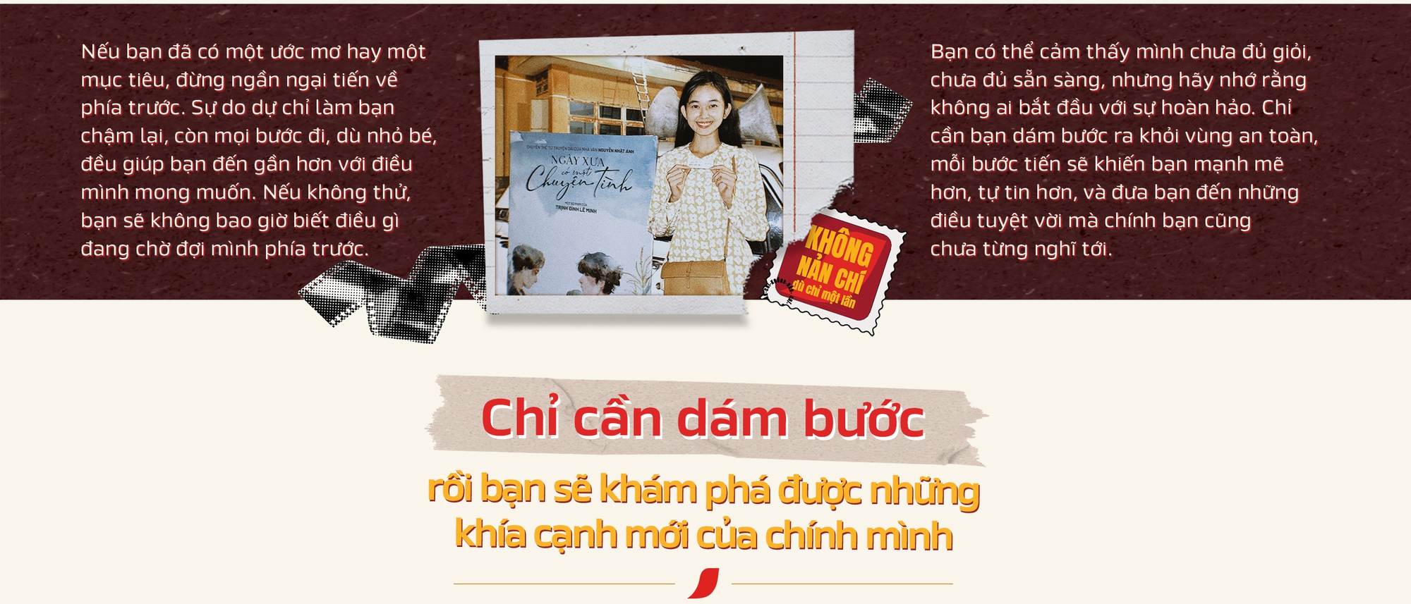 "Bước tiến" không nhất thiết phải to lớn, dài rộng. Đôi khi, một quyết định nhỏ, một lần "dám bước" cũng đủ thay đổi cuộc đời. Ra khỏi vùng an toàn, dám thử thách bản thân, dám tin tưởng vào khả năng bản thân dù đã có lúc nghi ngờ, bạn sẽ tạo nên con đường đến với thế giới rộng mở.