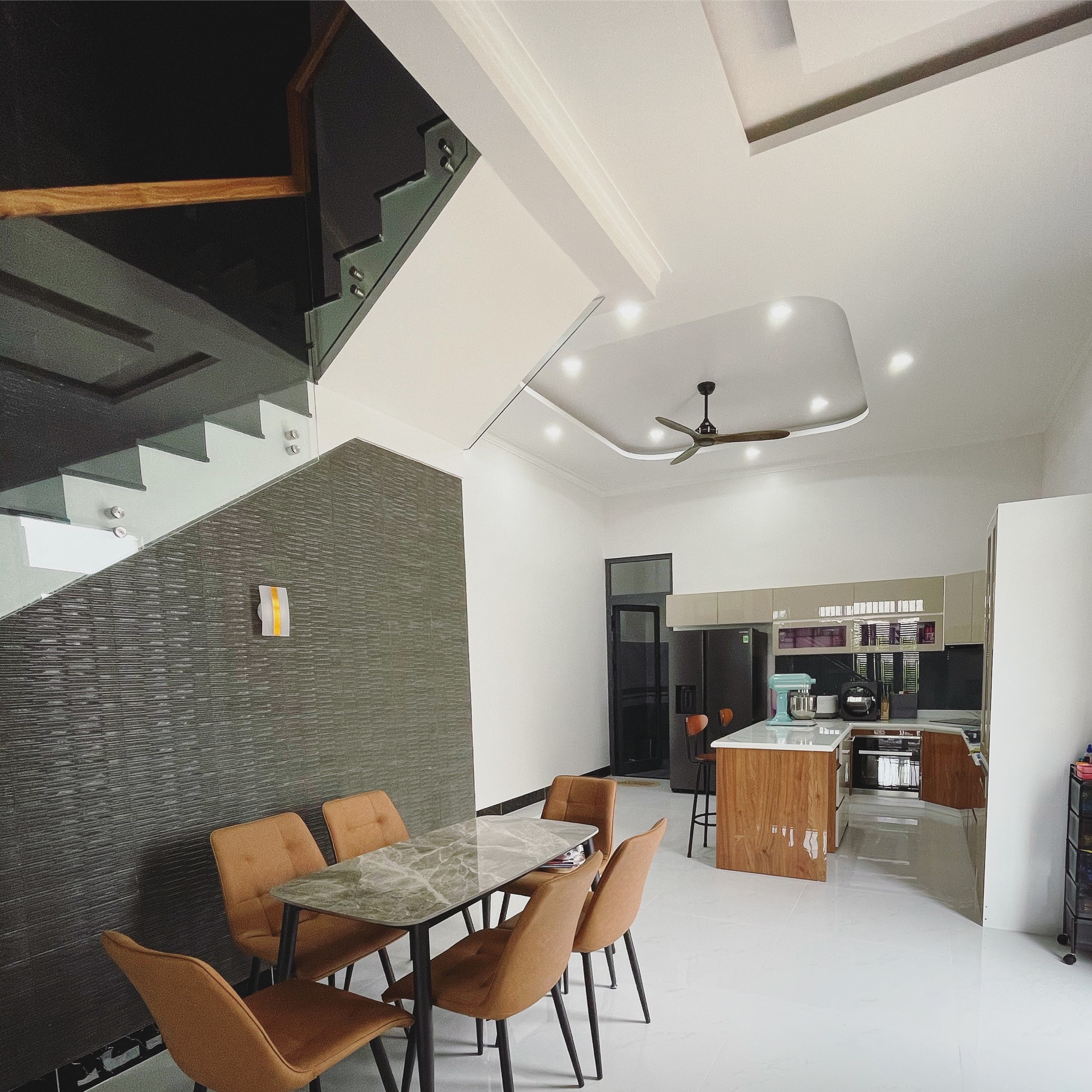 Giai đoạn thi công của nhà mình rơi vào ngay thời điểm cách ly xã hội. Vì thế nên cũng bị gián đoạn nhiều công đoạn, vận chuyển thì khó khăn. Thời gian đó, may mắn là có ông bà hỗ trợ rất nhiều cho gia đình mình.