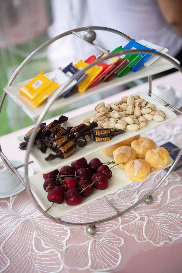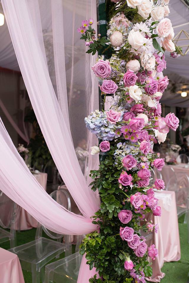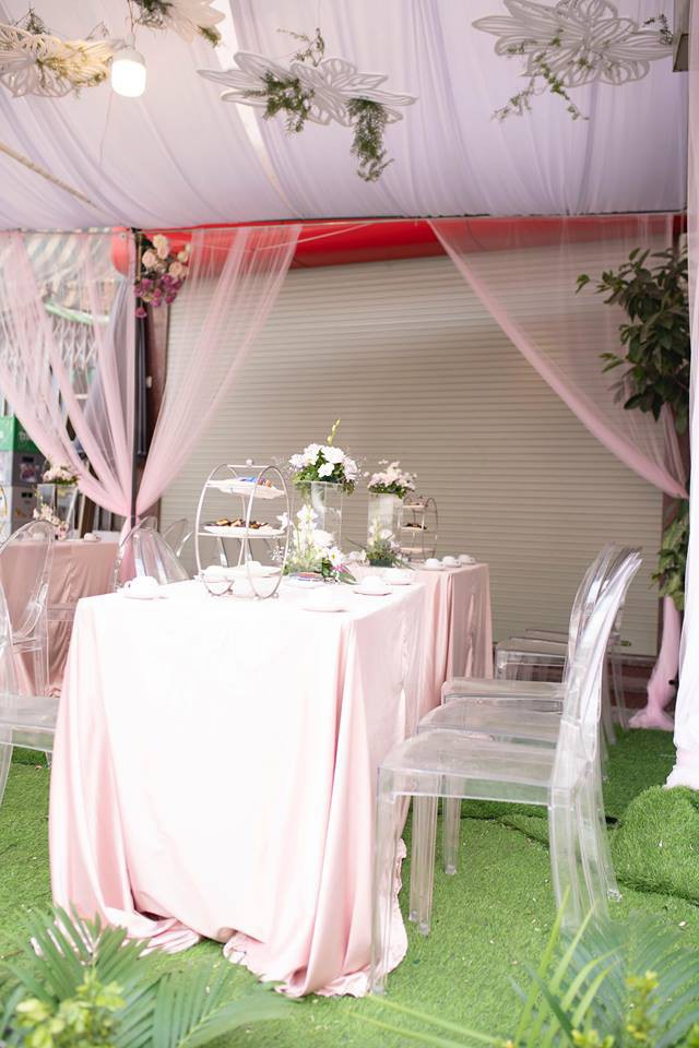 Thiết kế ăn hỏi được làm theo giống một khu vườn cổ tích, tông chủ đạo là hai màu hồng trắng khá lãng mạn và cầu kì.