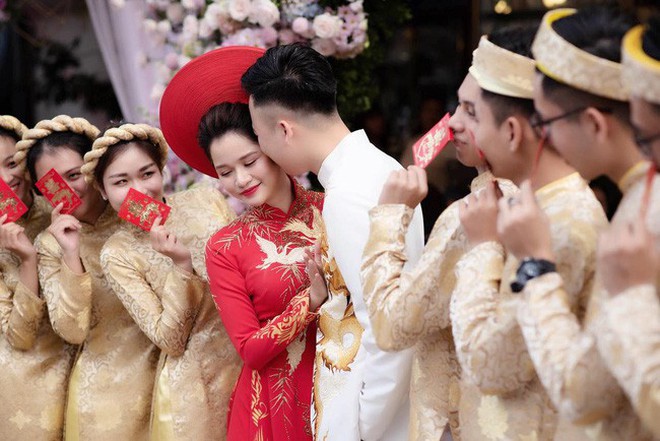 Áo dài trong ngày ăn hỏi của cô dâu và chú rể đều lựa chọn cùng một nhà thiết kế là áo dài Hương Vip. Phần đuôi áo kéo dài quét đất và được thêu tay tỉ mỉ từng hoạ tiết. Trái ngược với tính cách của Huyền Trang Bất Hối khá mạnh mẽ và cá tính nhưng lại chọn tông màu sắc cho ngày ăn hỏi rất ngọt ngào.
