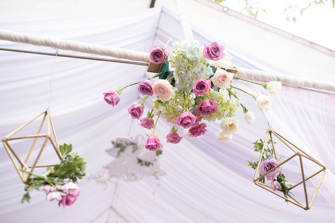 Tất cả hoa trang trí trong lễ ăn hỏi của Huyền Trang đều được sử dụng bằng hoa tươi: như cẩm tú cầu, hoa hồng... với rất nhiều loại hoa khác được phối cùng nhau.