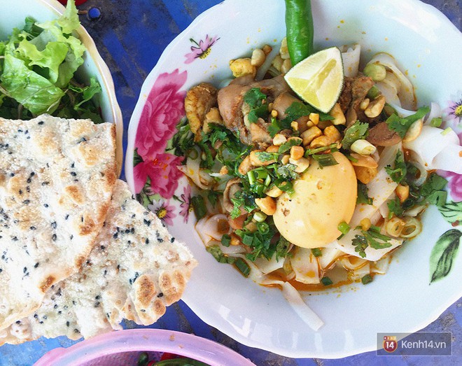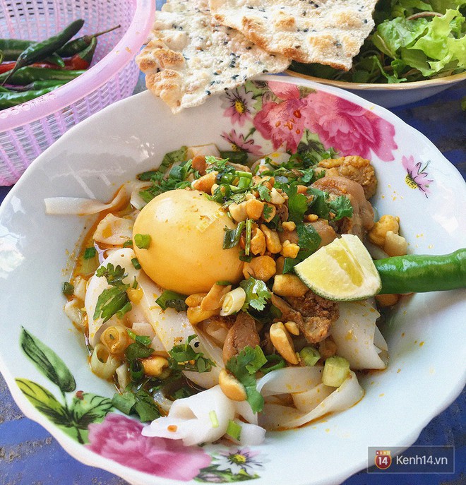 Mì Quảng giản dị lắm, thế mà lúc nào nó cũng cho người ta đủ đầy những hương vị vừa thơm, vừa đậm đà của một món ngon tinh tế cổ vị. Gắp một đũa mì cho vào miệng, cảm nhận từng chút viên mãn của sự hòa quyện trọn vẹn giữa sợi mì dai dai, đượm mùi gạo thơm và nước dùng béo đậm ngon lành. Ăn mì Quảng, lại phải đi kèm dăm chục thứ rau sống tươi xanh, thêm chút lạc rang, bánh tráng giòn rụm rồi cắn một miếng ớt thật cay mới trọn vị!