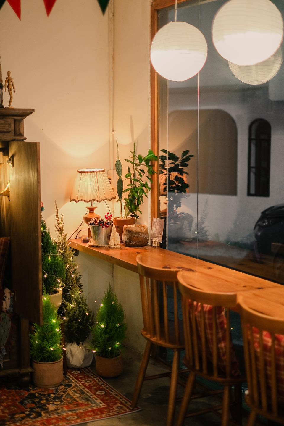 Tọa lạc tại quận 3 trong con hẻm Lê Văn Sỹ, The Seat Cafe là một quán cà phê mang phong cách vintage với nhiều cây xanh. Hòa cùng không khí rộn ràng cho một mùa Giáng sinh an lành đang cận kề, The Seat Cafe đã “rục rịch” từ rất sớm. Góc Giáng sinh nhỏ của quán được bày trí đơn giản với tâm điểm là chiếc tủ gỗ mộc mạc đặt giữa tấm thảm len dệt nhiều hoạ tiết, xung quanh có vài cây tùng nhỏ lấp lánh ánh đèn, thêm những chiếc đèn vàng, cây thông... tất cả mang đến một khung cảnh vô cùng nhẹ nhàng, ấm cúng, nhưng cũng không kém phần rực rỡ.