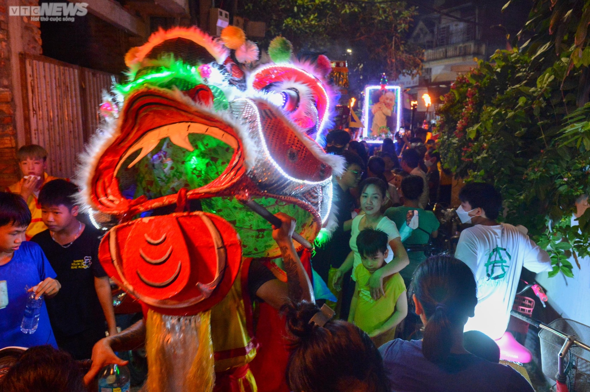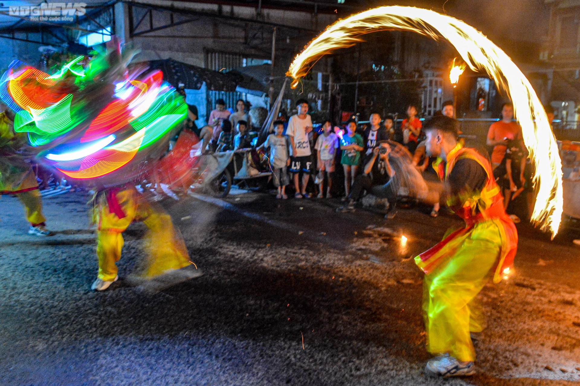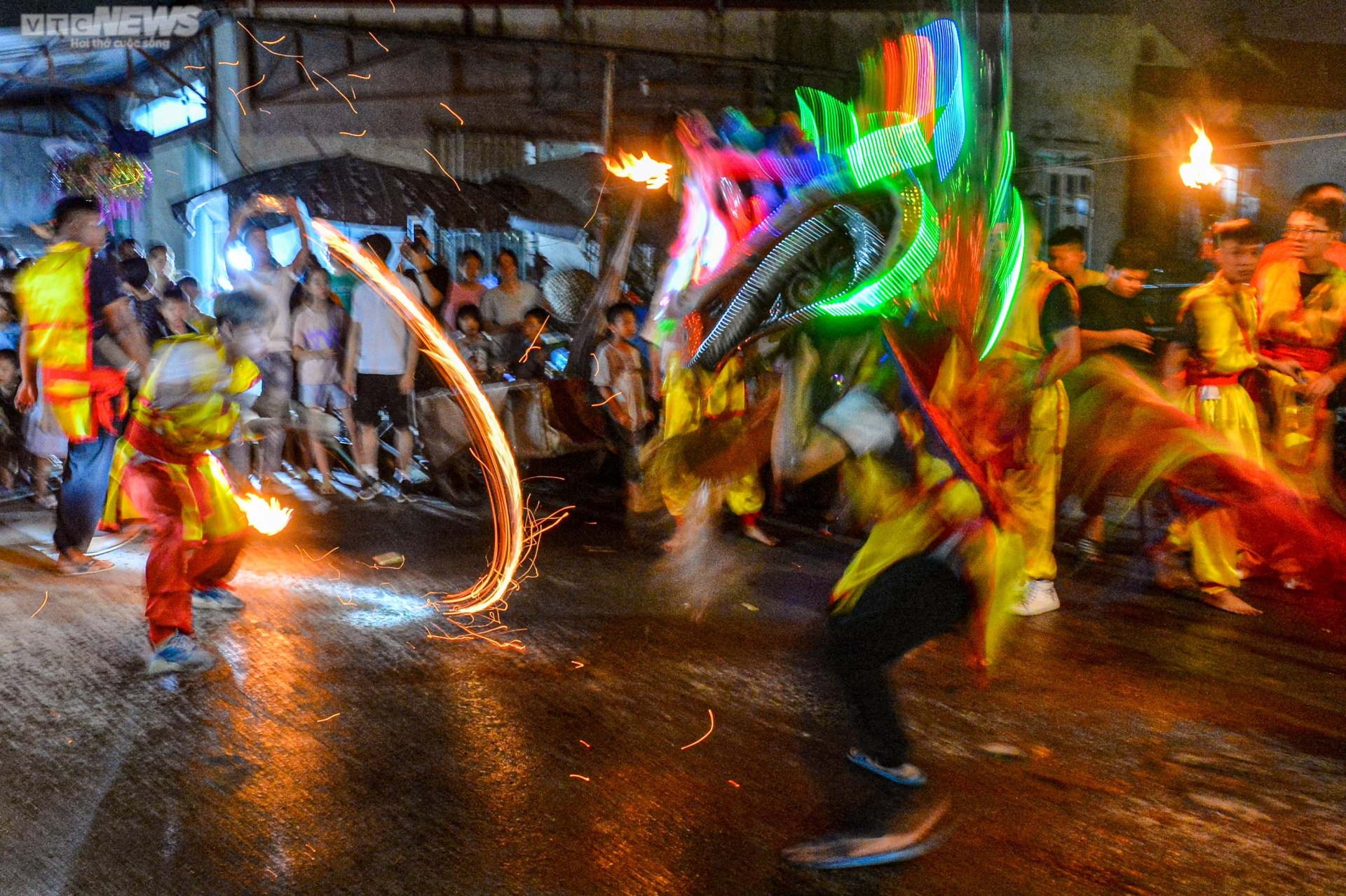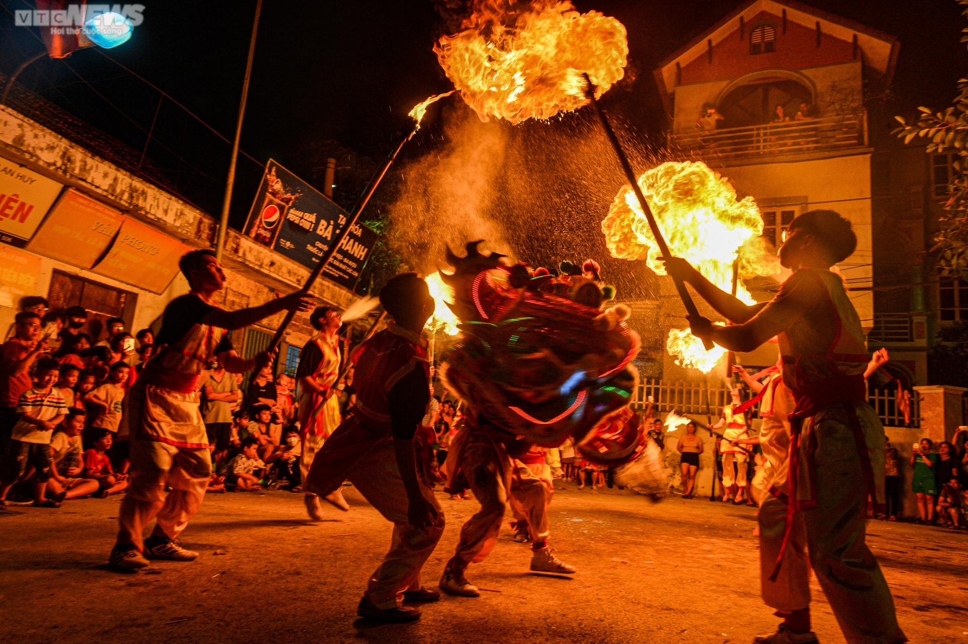 Đội lân sư rồng biểu diễn múa đuốc thu hút nhiều người xem.