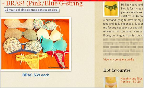 Đây là lần thứ 2 một teen girl Singapore rao bán đồ lót trên blog cá nhân. Cô bạn này tiết lộ một số thông tin cá nhân: bạn ấy tên là Nadya, hiện tại mới 16 tuổi, đang học trung học, bán đồ lót đã qua sử dụng để lấy tiền nộp học phí cũng như chi tiêu hàng ngày.