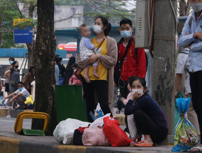 Nhiều người dân đứng chờ xe buýt ở bến xe sau khi di chuyển từ quê lên thành phố bằng xe khách