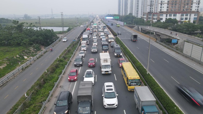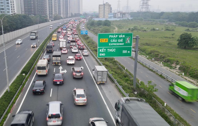 Trong khi đó, khu vực điểm cuối đường cao tốc Pháp Vân ùn dài hàng km do lưu lượng ô tô từ các tỉnh đổ về trung tâm thành phố đông. Các phương tiến nối đuôi nhau di chuyển chậm.