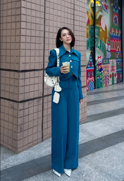 Không chỉ blazer đơn lẻ, Huyền Lizzie còn diện nguyên cả bộ suit cách điệu đến công sở. Đương nhiên blazer siết eo vẫn là mảnh ghép không thể thiếu, cô nàng kết hợp blazer cùng quần ống rộng cạp cao hack chân thon dài, vóc dáng cao ráo, sang chảnh.