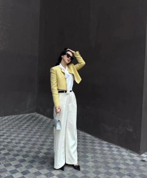 Kết hợp cùng blazer lửng, Quỳnh Lương sẽ chọn quần ống rộng hay chân váy cạp cao, đôi khi là một set matching để không chỉ hack chiều cao triệt để mà còn tạo nét đồng điệu thời thượng mà vẫn giữ sự chỉn chu cho chị em công sở tuổi 30.