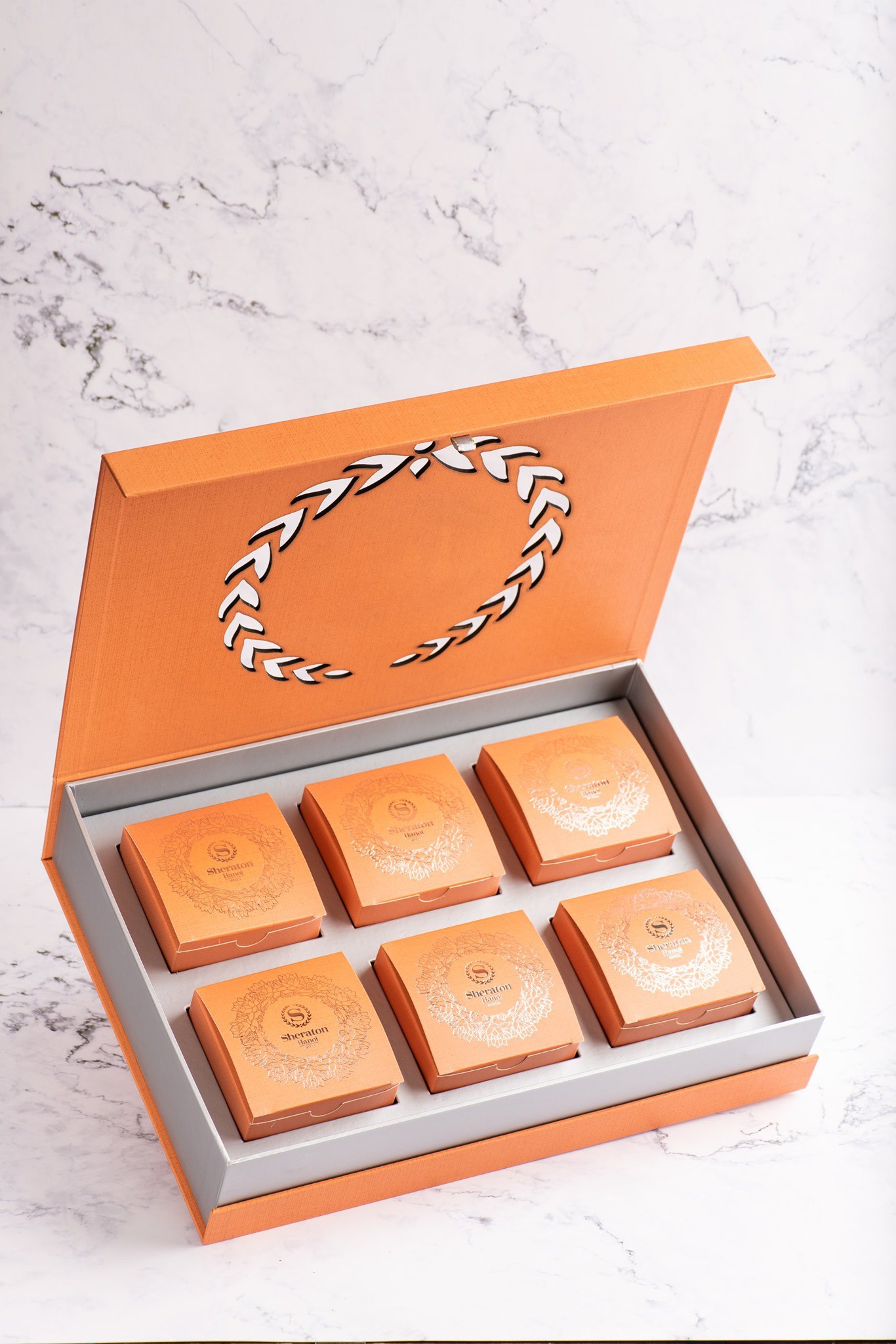 Bánh Trung thu của khách sạn Sheraton Hanoi được đóng hộp 2 bánh có giá là 410.000đ/hộp, hộp 4 bánh loại 180gr và hộp 6 bánh loại 100gr đều có giá là 850.000đ/hộp. Đặc biệt, hộp 3 bánh kèm một chai rượu vang có giá 1.500.000đ/hộp.