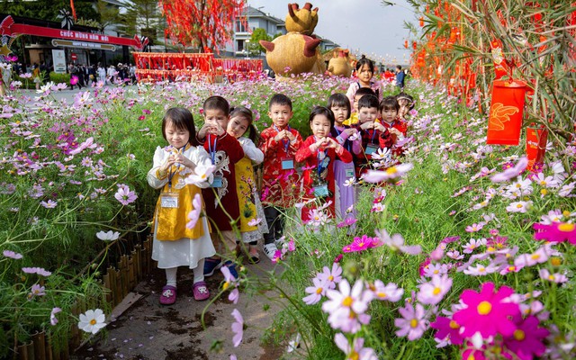 Các "du khách nhí" diện áo dài du xuân giữa đường hoa Home Hanoi Xuan 2023. Ảnh: Đình Tùng
