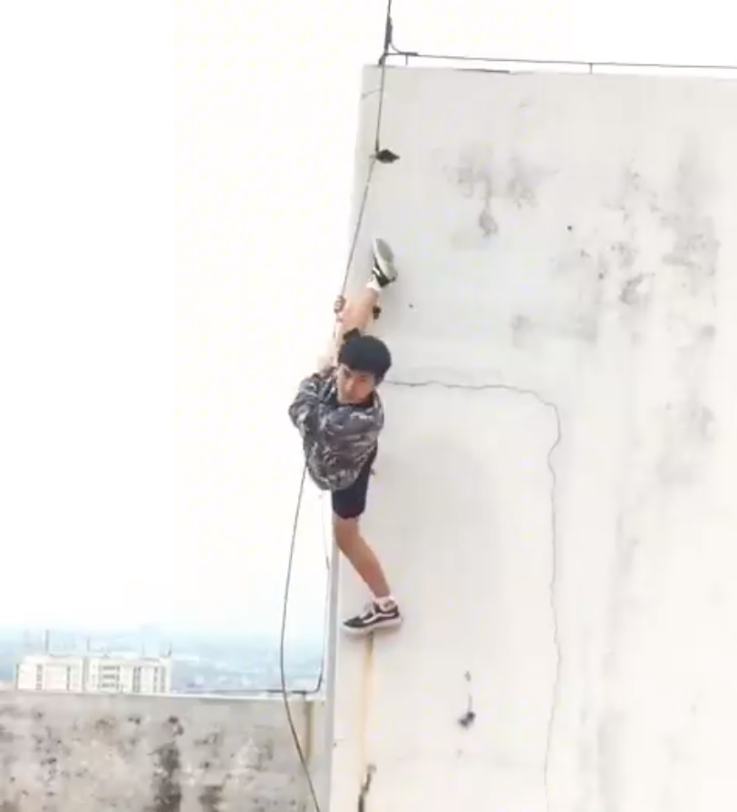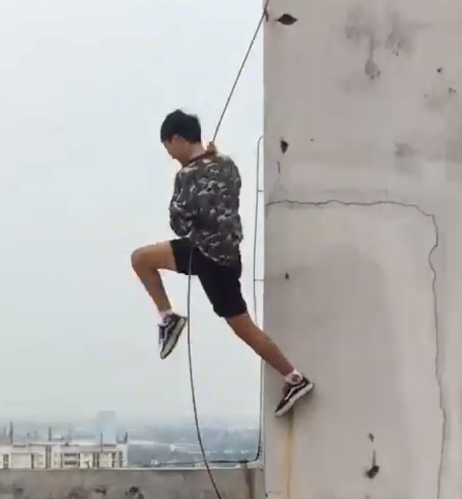 Đoạn cuối clip, anh chàng còn chẳng ngại bám lên một cọng dây sắt, treo mình lơ lửng trên không trung, tạo dáng hệt như các thử thách khó nhằn mà Next Top Model đưa ra để thử thách sự gan dạ và khả năng của thí sinh.