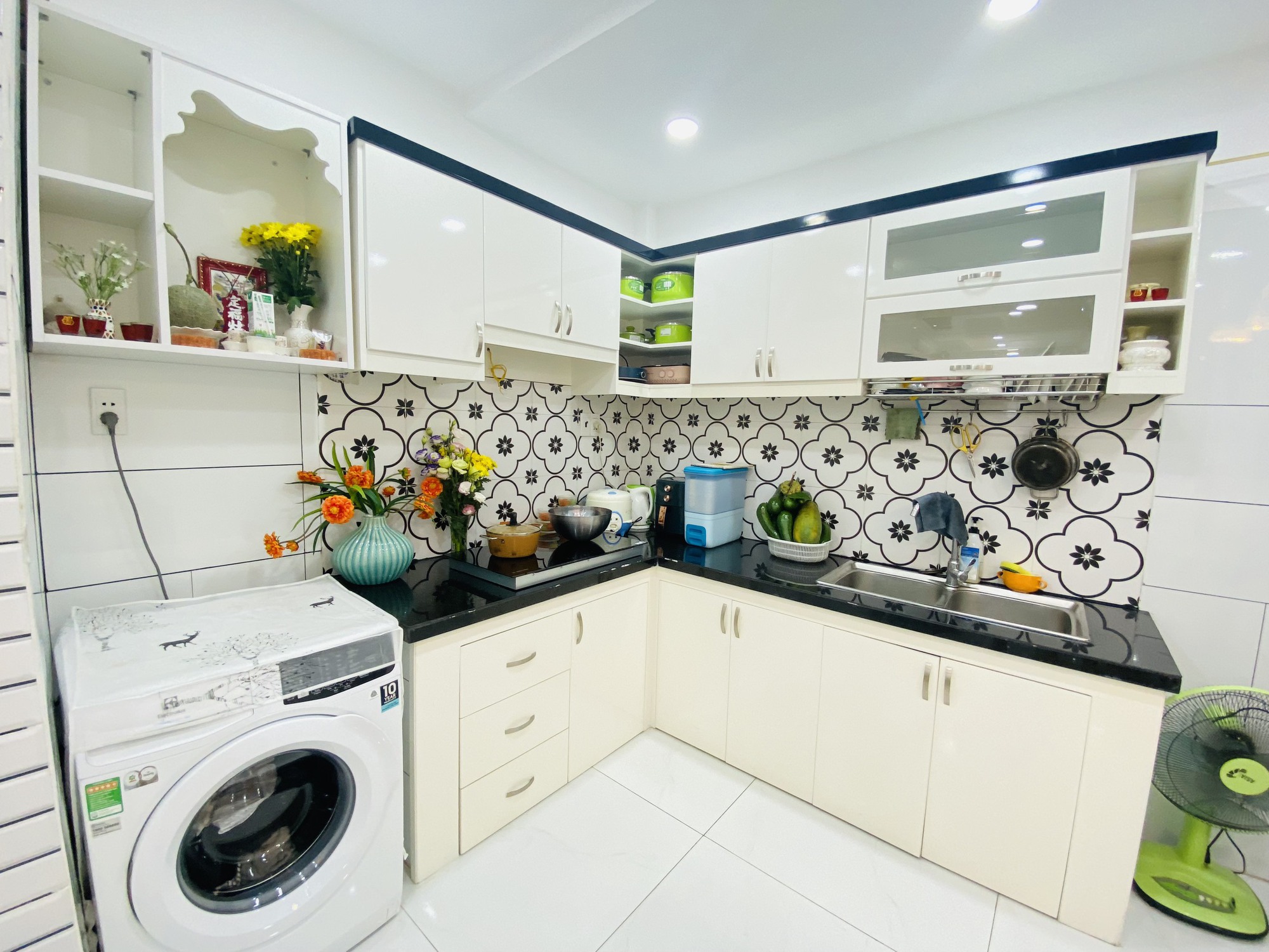 Phòng bếp được ốp hoàn toàn bằng gạch, vừa sạch sẽ lại tiện trong việc lau chùi, dọn dẹp. Hơn nữa, vì 2 vợ chồng mình đều mệnh Mộc nên nội thất hầu như đều lựa chọn gỗ: