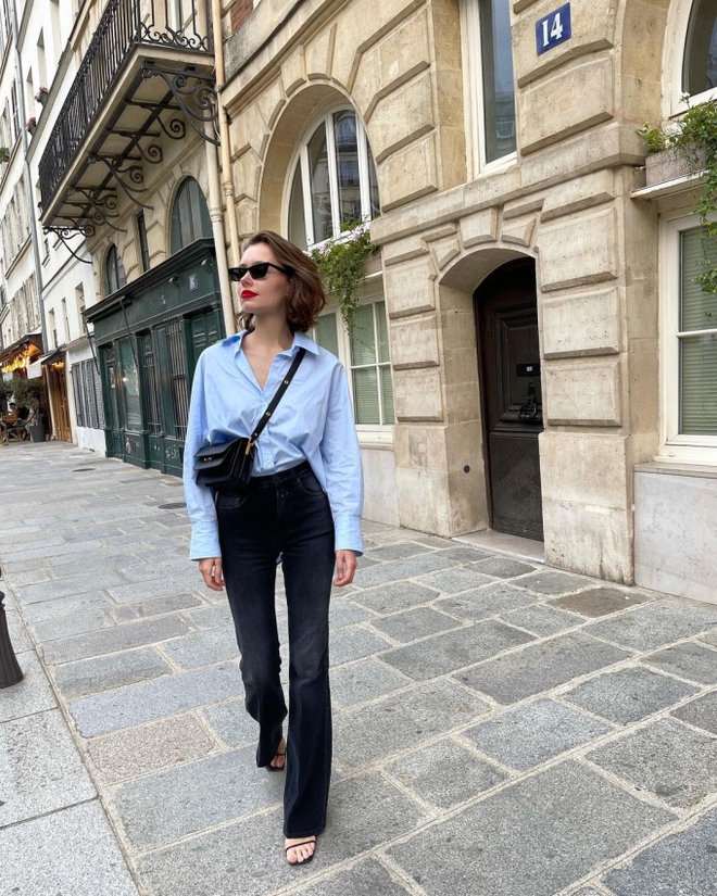 Nếu bạn không biết phải biến hóa chiếc áo sơ mi trong tủ sao cho mới lạ thì hãy để Ksenia Kov gợi ý. Đầu tiên là công thức kinh điển khi kết hợp chúng với những chiếc quần jeans ống loe và ống rộng. Thay vì diện giày thể thao, bạn hãy phối cùng một đôi dép sandal đế cao giống Ksenia Kov để trở nên sang trọng và thanh lịch hơn.