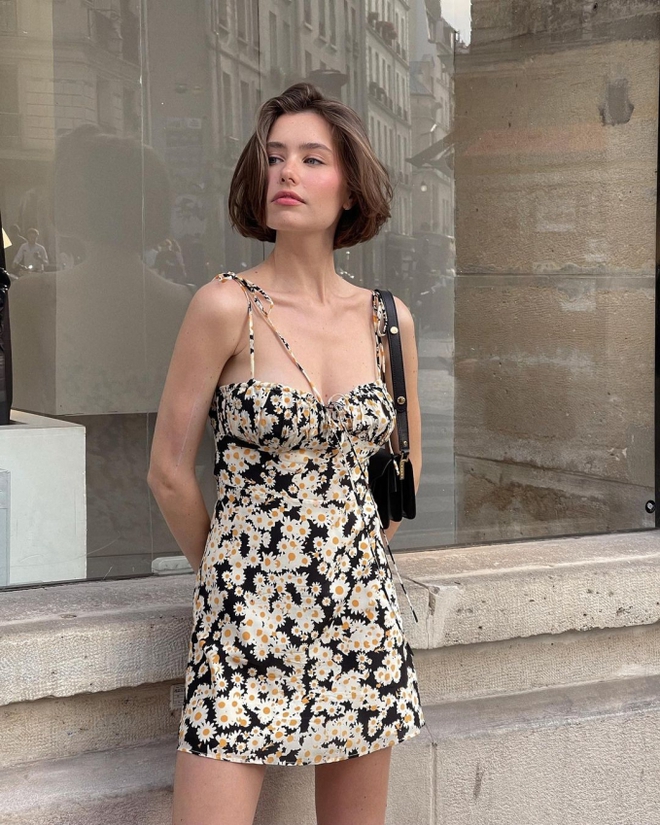 Nhắc đến thời trang Pháp là phải nhắc đến những chiếc váy hoa nhí 2 dây vừa điệu đà lại vô cùng quyến rũ. Với Ksenia Kov, cô sở hữu rất nhiều váy hoa nhí với đủ màu sắc và họa tiết khác nhau. Những lúc ra ngoài, Ksenia Kov chỉ phối thêm một chiếc túi xách mini là đã trông sành điệu và sang chảnh hơn rất nhiều.