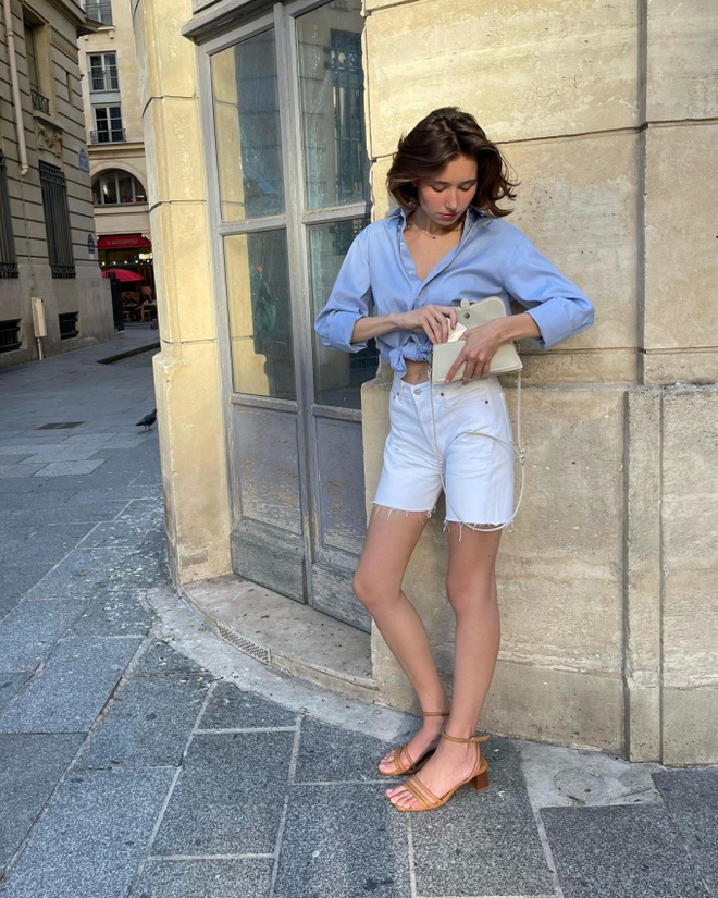 Bạn không nên ''đóng khung'' bản thân khi chỉ diện áo sơ mi với quần dài. Thay vào đó, hãy mix cùng 1 chiếc quần short denim rách sáng màu giống quý cô người Pháp này. Màn kết hợp tưởng không ăn nhập này sẽ giúp chị em có được diện mạo phóng khoáng, hiện đại và vô cùng hấp dẫn.