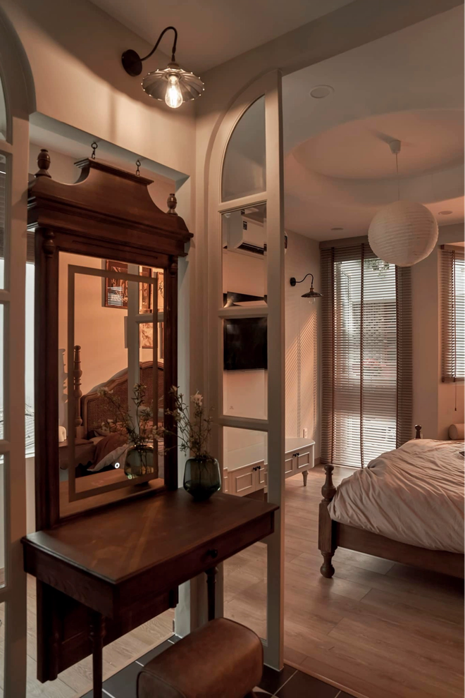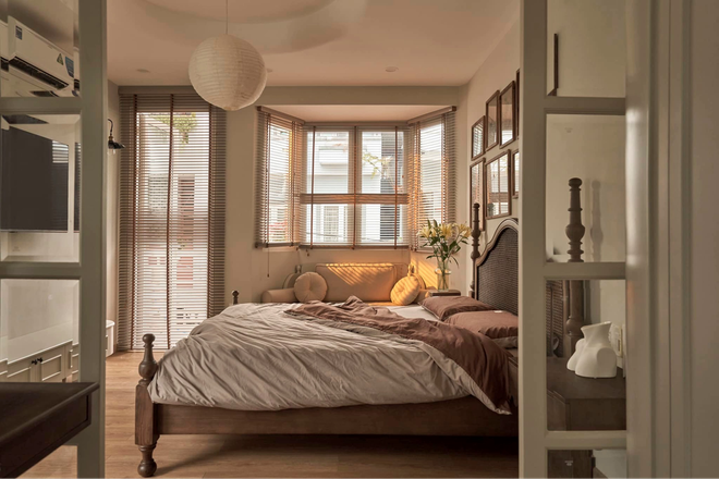 Vì muốn có một không gian rộng rãi, nên tụi mình đã thiết kế rất nhiều cửa sổ. Phòng ngủ chia thành 2 khu vực tách biệt: Một bên là tủ đồ và bàn trang điểm, một bên là phòng ngủ và ban công