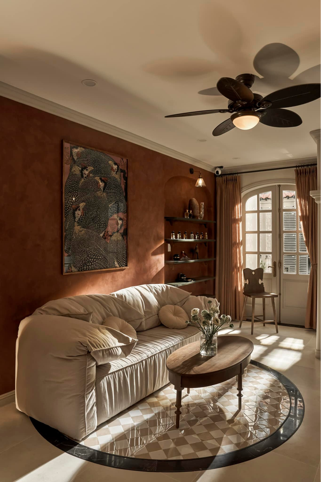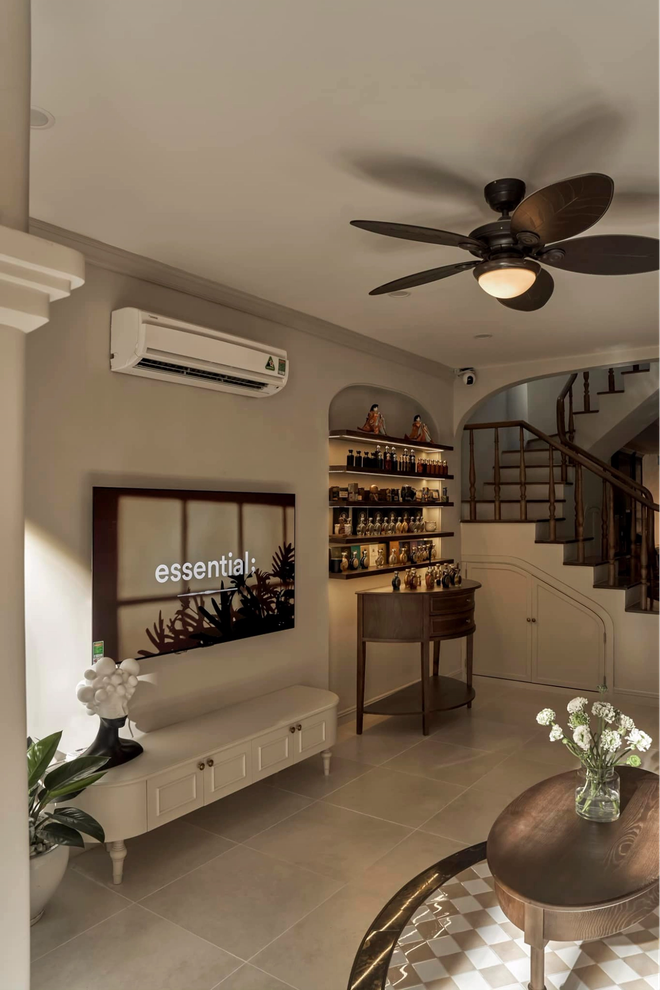 Phong cách thiết kế mà Mỹ Lệ chọn cho căn nhà là indochine, là sự kết hợp sự hoài cổ và hiện đại. Tuy còn khá trẻ nhưng cả 2 vợ chồng Lệ đều thích sự cổ điển, nhẹ nhàng. Được phối giữa các tone màu thiên ấm như be sữa, nâu cam nên tổng thể căn nhà trông rất ấm áp: