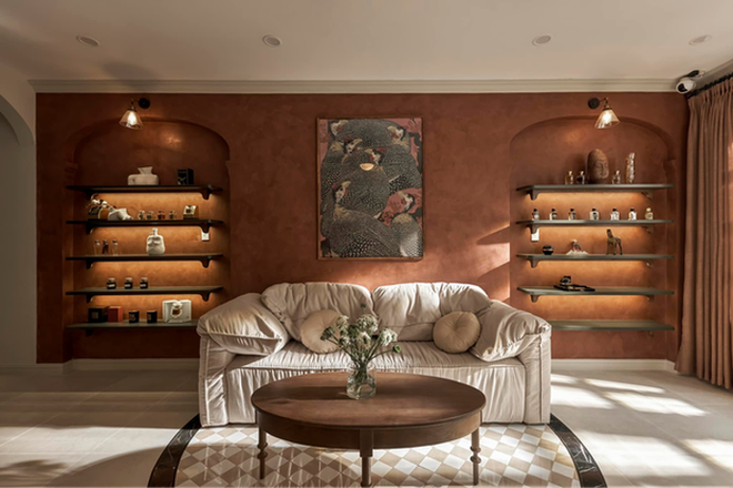 Phòng khách khá rộng và được bài trí bắt mắt. Nội thất được chọn lựa kỹ càng, khi kết hợp với nhau tạo nên một không gian giống khu trưng bày cao cấp: Nước hoa và tranh được sắp xếp như một khu triển lãm nhỏ trong nhà.