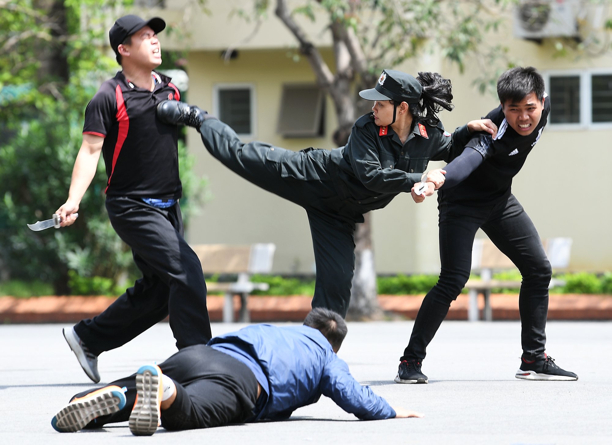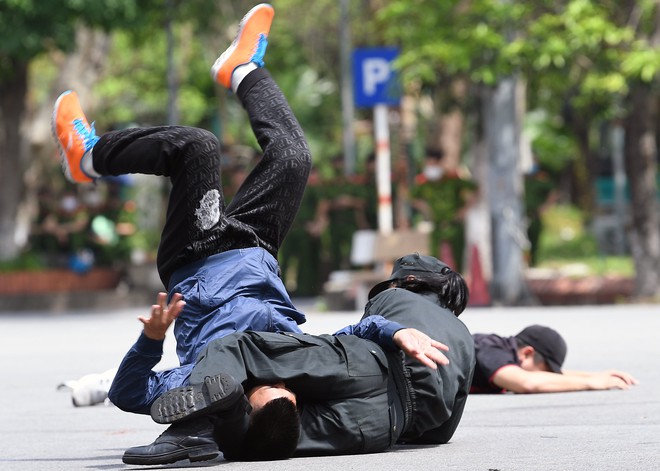 Trong buổi diễn tập, các chiến sỹ của Tiểu đoàn Cảnh sát đặc nhiệm số 1 K02 phối hợp với Khoa Cảnh sát vũ trang còn phô diễn các kỹ thuật, chiến thuật xuống dây để tiếp cận nổ súng trấn áp tội phạm bắt cóc con tin, cố thủ trên nhà cao tầng