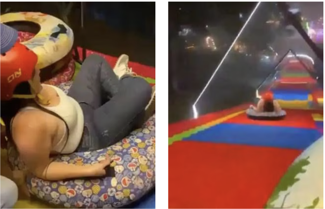 “Có ai ở dưới đón tôi không?” người phụ nữ hỏi khi đang ngồi trong chiếc phao cao su chuẩn bị trượt xuống.