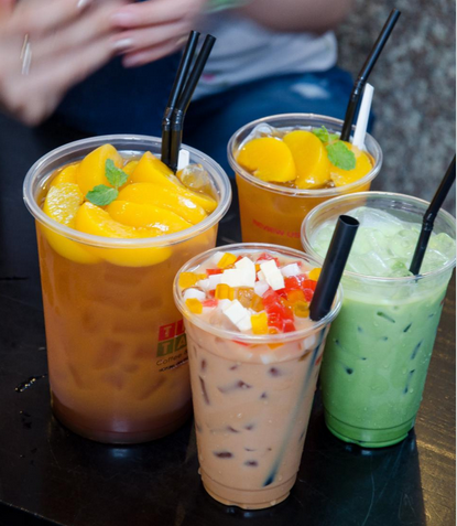 Đơn giản chỉ là trà sữa truyền thống hoặc thêm các loại mứt xoài, dâu, si rô hương đào, vải để tạo mùi vị khác biệt. Điểm nhấn là phần topping đầy ụ cực kì đa dạng, phong phú như phô mai tươi, trân châu, thạch trái cây, bánh flan… khiến chúng ta choáng ngợp trước ly trà sữa khổng lồ hấp dẫn và kích thích vị giác.
