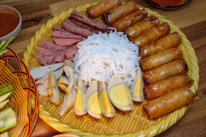 Món này bài trí rất đẹp mắt như một bức tranh ẩm thực đa dạng về nguyên liệu và rực rỡ sắc màu. Riêng món rau đã rất phong phú với húng lủi, quế, dưa leo, xoài, bắp chuối, trứng tráng mỏng, thịt ba chỉ cắt sợi...
