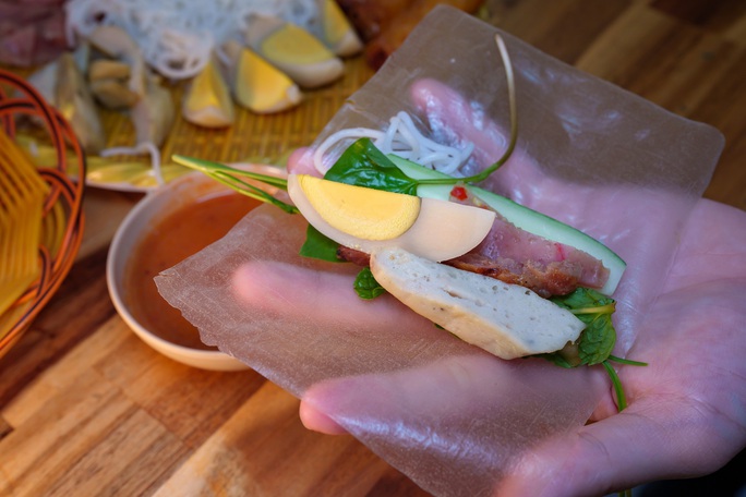 Có một chút chát bùi của bắp chuối, có vị chua của xoài cắt sợi, có mùi thơm của rau húng, có thịt ba chỉ đại diện cho trên cạn và con cá đại diện cho biển cả. Chỉ 1 cuốn, chấm nước mắm đậu phộng thì cả trời đất Phan Thiết nằm trong miệng.