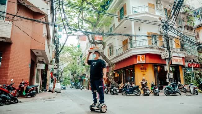 Chủ quán phở đang lướt trên xe điện cân bằng. - Nguồn: Internet