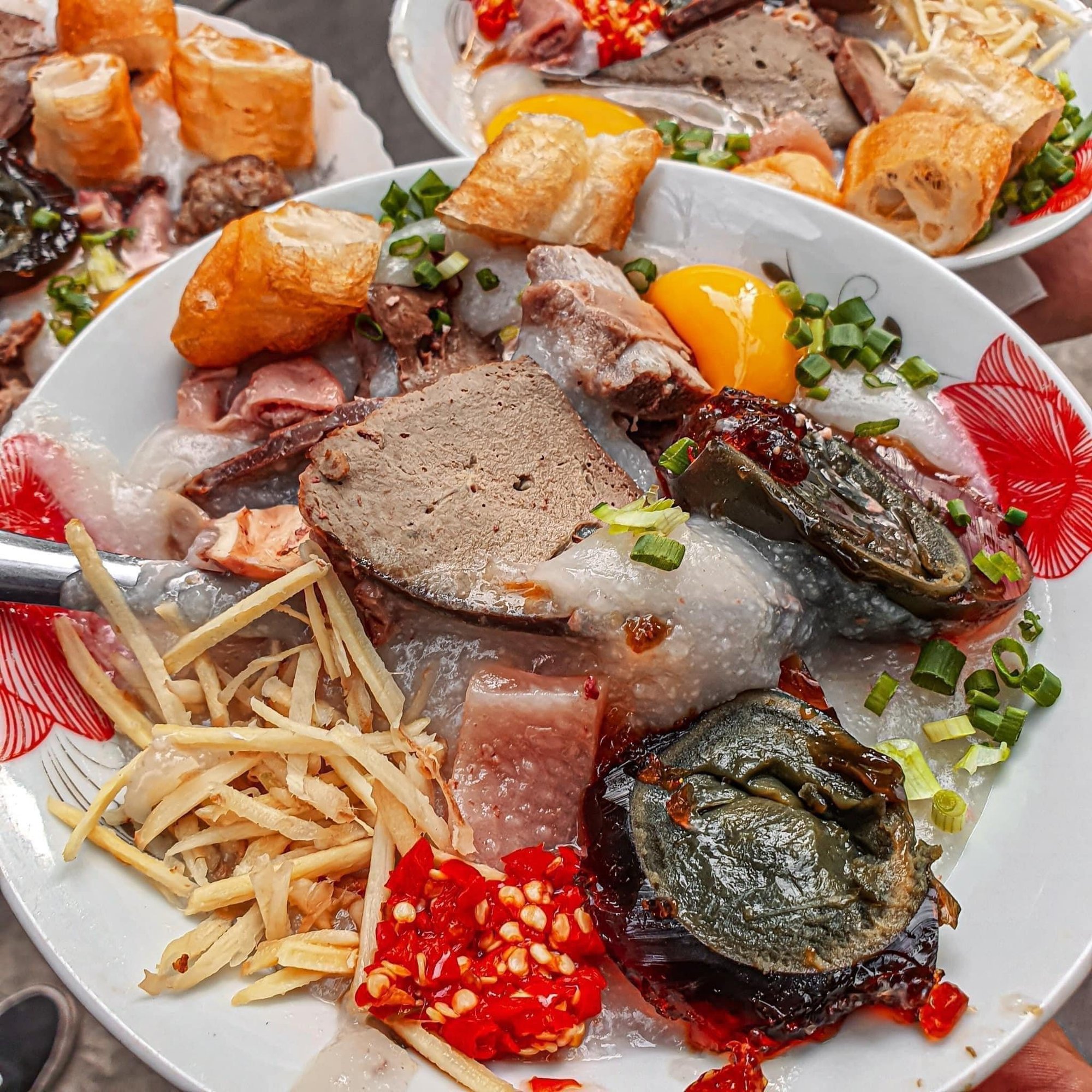 Món ăn kèm với cháo rất phong phú bao gồm trứng bắc thảo, bao tử, gan, da heo, mực, sụn... Quẩy ở đây luôn được nướng giòn và ít dầu mỡ. Ngoài ra, có một món khá hấp dẫn mà ai cũng nên thử qua chính là ăn cháo với trứng sống. Cực dễ thương nữa là trước quán sẽ có 1 tấm biển ghi dòng chữ “Xin quý khách vui lòng giữ yên lặng để hàng xóm nghỉ ngơi” vô cùng văn minh và tinh tế.
