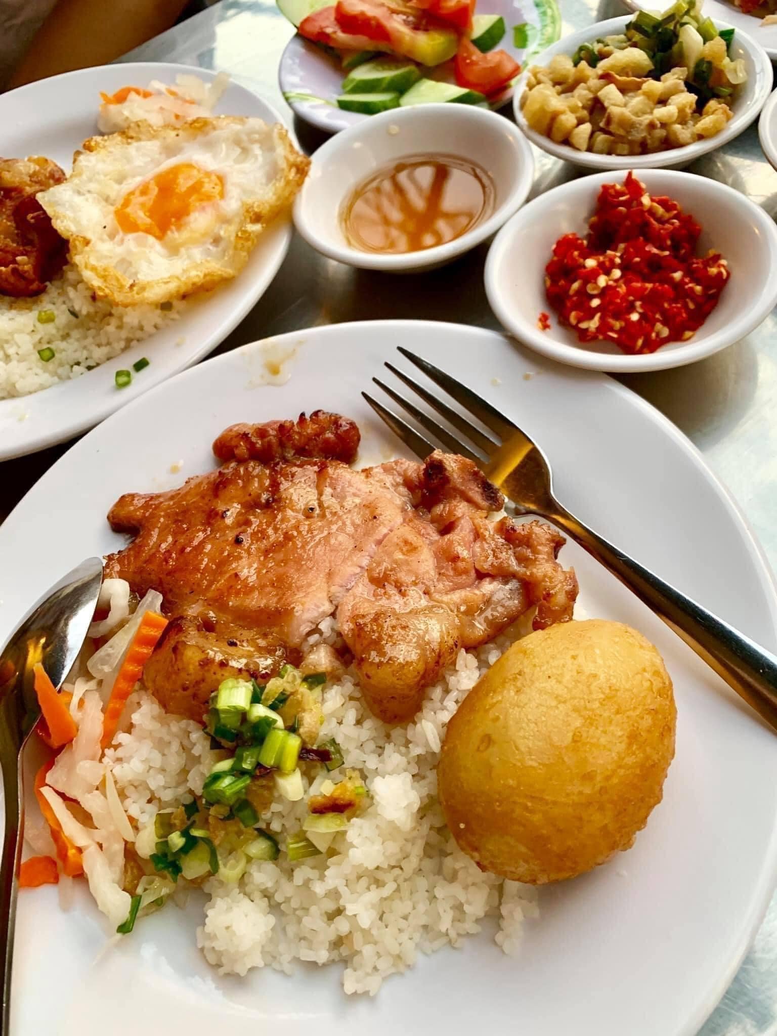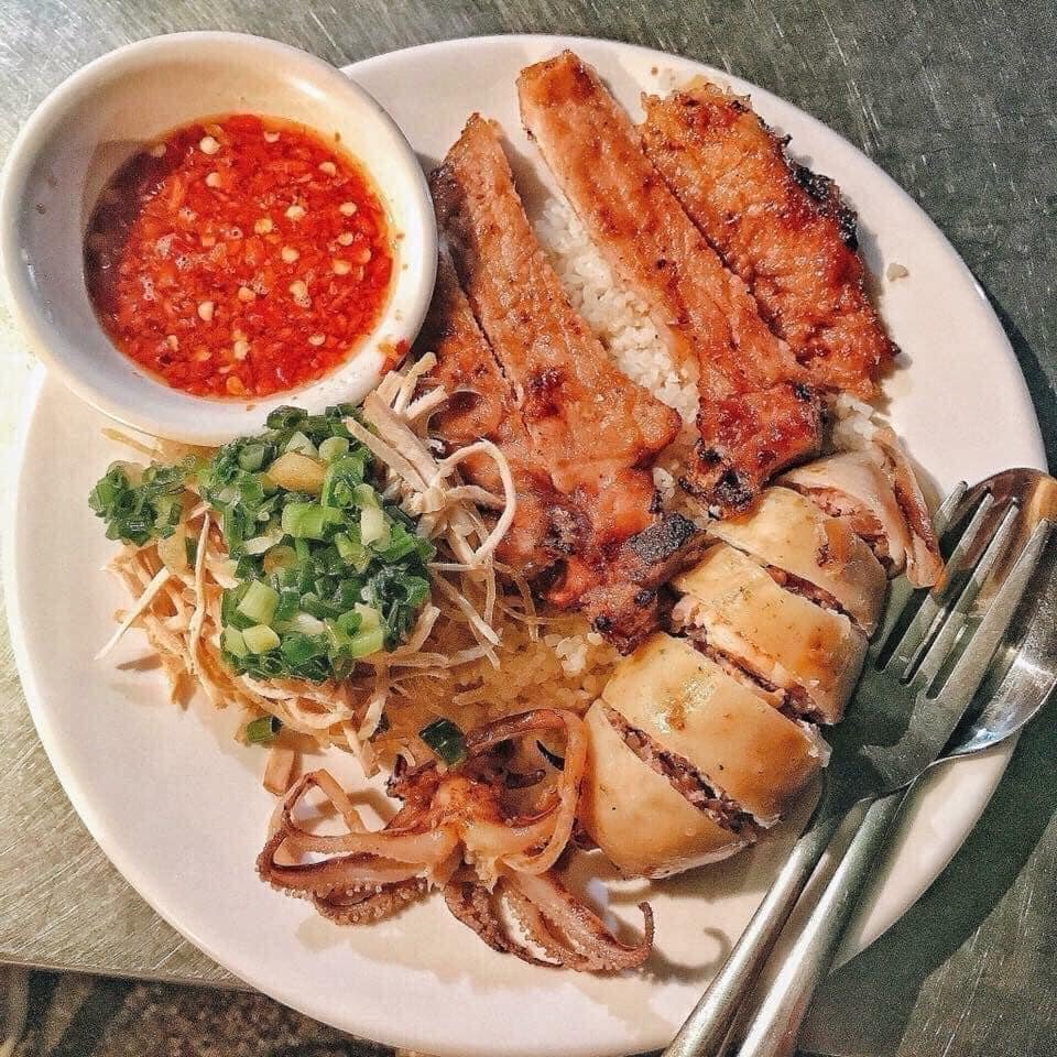 Được biết tiệm cơm tấm này đã hoạt động trên 30 năm, vị trí nằm ở đằng sau Xóm Chiếu, bày bán trên vỉa hè khá rộng rãi và luôn được cô Bảy (chủ tiệm cơm) quét dọn sạch sẽ. Một dĩa cơm tấm có giá dao động từ 70.000đ - 100.000đ với “topping” rất đáng đồng tiền bát gạo. Thớ thịt sườn to, kèm với mỡ hành, cà chua, dưa leo, cùng cơm nóng hổi lúc nào cũng đầy dĩa nhìn rất hấp dẫn. Ngoài sườn nướng, ở đây còn có thêm sườn cây, tai heo, ba chỉ quay, gà rán, mực nhồi, xúc xích,… cùng đồ xào. Điều làm cơm tấm ở đây được nhiều người ghé đến là phần nước chấm được làm theo công thức riêng, rất đậm đà và bắt vị.