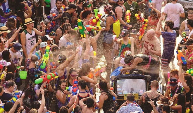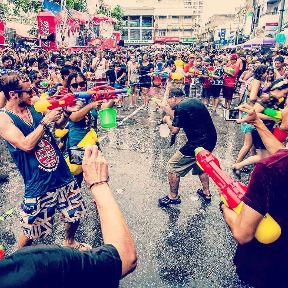 - Có một số địa điểm đặc biệt sôi động với hoạt động té nước. Nó gọi là Battlefied. Các địa điểm diễn ra Battlefied thường là những trung tâm thương mại lớn, địa điểm vui chơi đông người như Central World, Silom, Khao San, và các quán bar trong khu gần Route66…