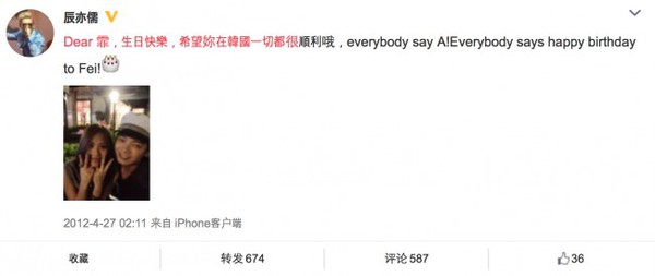 Thần Diệc Nho gửi lời chúc mừng sinh nhật tới Fei. Thậm chí, trong chương trình "Japan Korea Music Craze" ngày trước, Thần Diệc Nho còn gọi Fei là "em yêu"