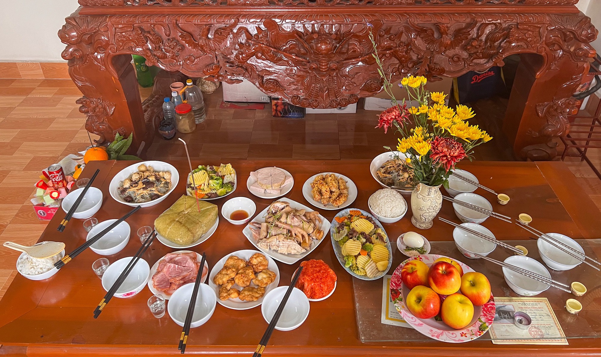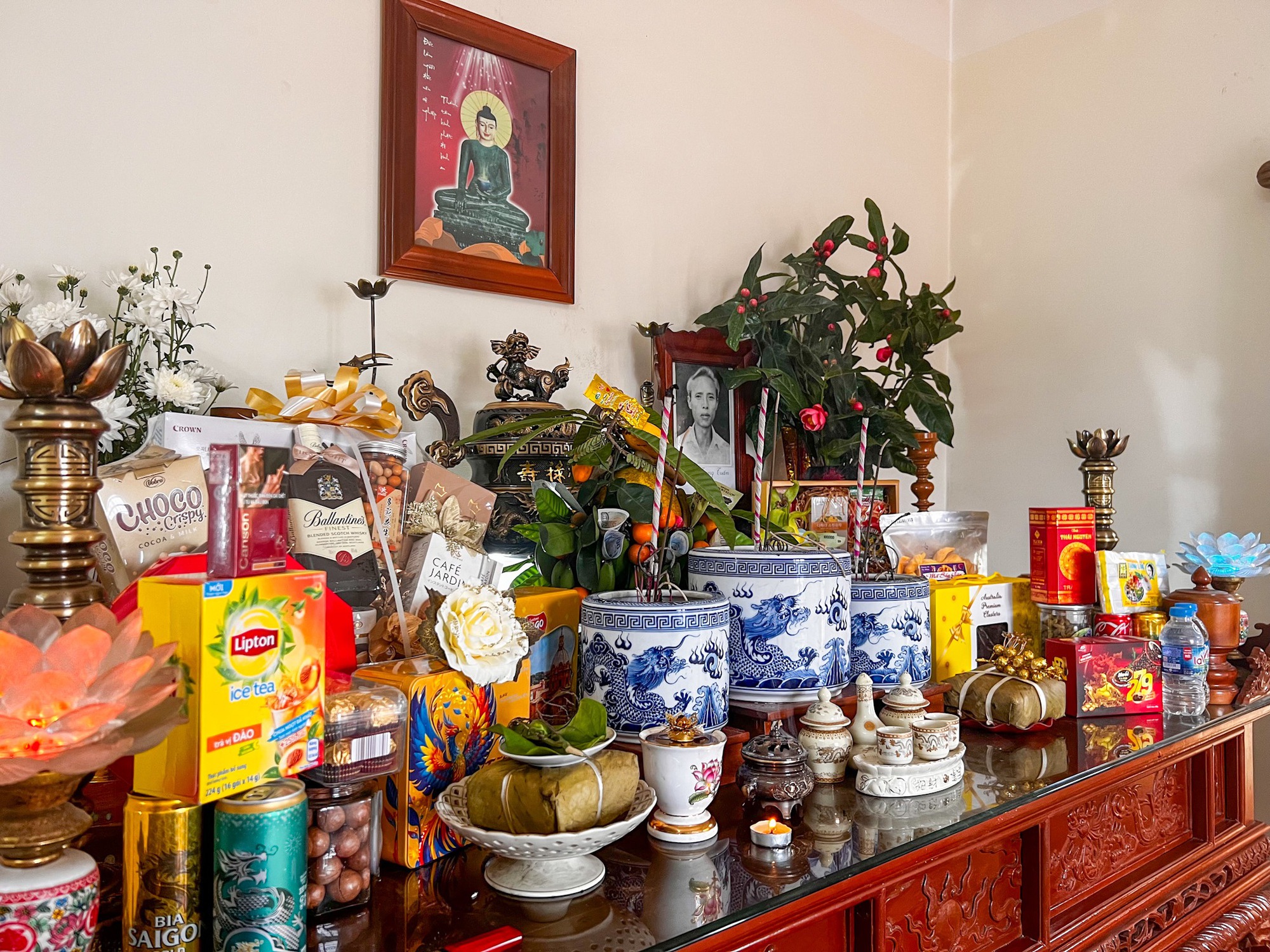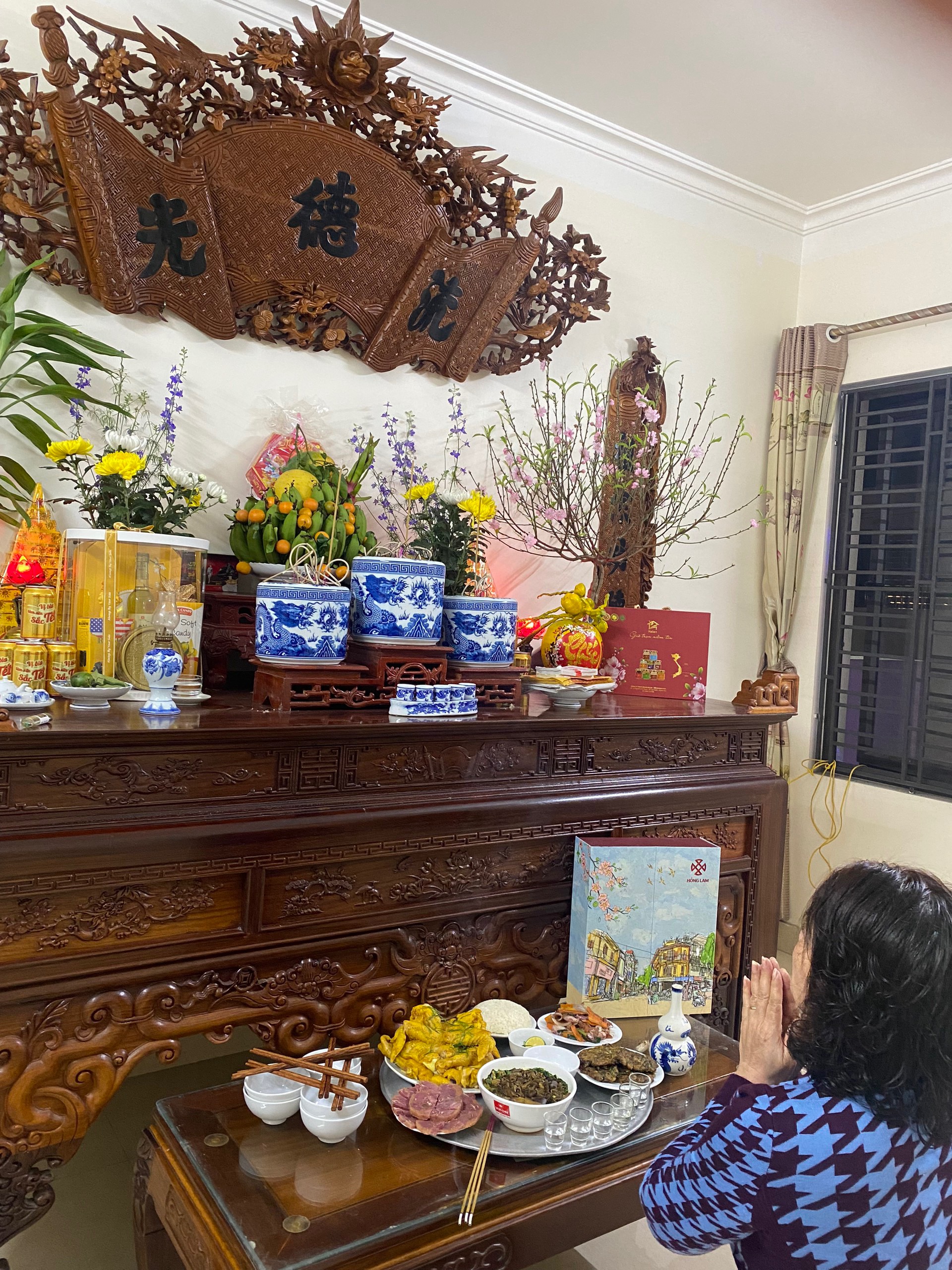 "Mình về nhà vào hôm 29 Tết, bố mẹ đã dọn nhà xong, nhiệm vụ cuối cùng là bày bàn thờ. Hôm nay thì phụ mẹ làm cơm cúng Tất niên, ăn xong sẽ đi nấu chè và chuẩn bị mâm cúng giao thừa. Mâm cúng nhà mình đơn giản lắm, thường thì sẽ có giò, chả mực, miến, thêm món xào và gà luộc", chị My My (Hải Phòng) chia sẻ.